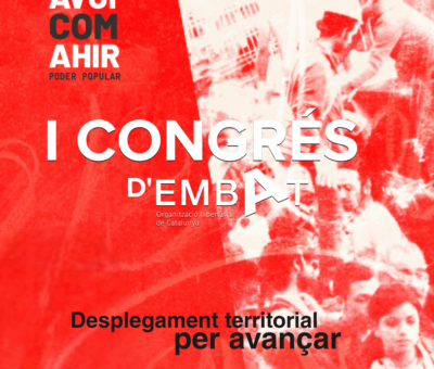 El passat cap de setmana del 25-26 d’octubre s’ha realitzat el Primer Congrés d’Embat, Organització Llibertària de Catalunya. Com ja és conegut, el 2013 es va iniciar el Procés Embat, que cap el 2015 va derivar en l’organització actual. Fins el moment hem funcionat seguint un esquema de reunions mensuals de treball i d’Asse